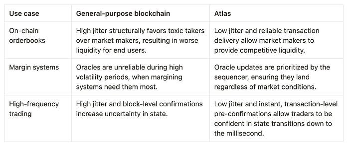Atlas е изграден специално за финансови приложения, които изискват надеждно доставяне на транзакции, почти нулеви разходи за транзакции, предварителни потвърждения със скоростта на светлината, чести и надеждни актуализации на оракули и честно подреждане.