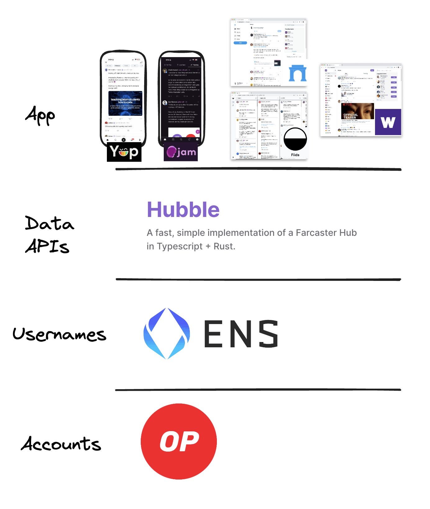Farcaster съхранява всички данни на потребителите на сървър, наречен Hub. Всеки може да поддържа този Hub, свързан с всички останали Хъбове по P2P мрежа.