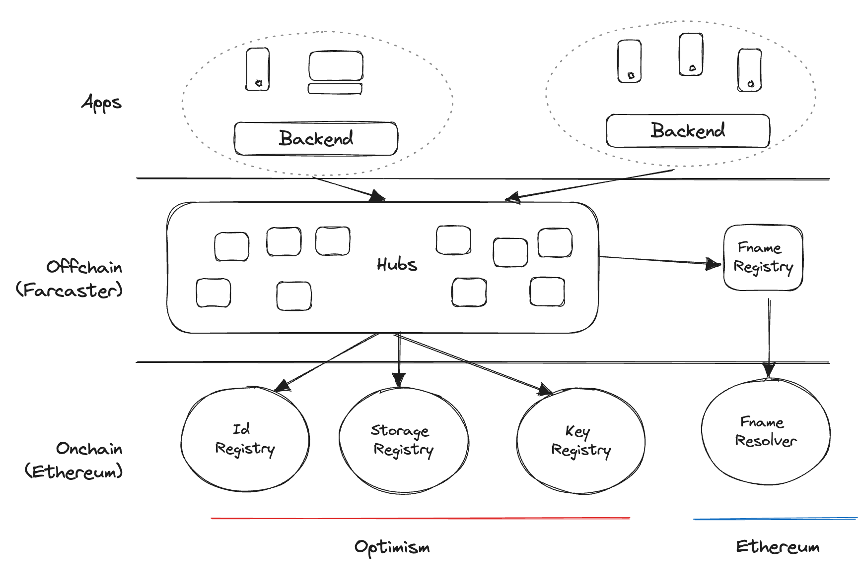 Off-chain системите се използват за често срещани действия, където е важна производителността. Съобщенията, създадени от потребителските акаунти, се съхраняват и разпространяват в P2P мрежа от Farcaster hubs. За разлика от блокчейн, мрежата използва модел за евентуална консистентност, който позволява бързо разпространение на съобщенията в обмен на по-слаб модел на консистентност.